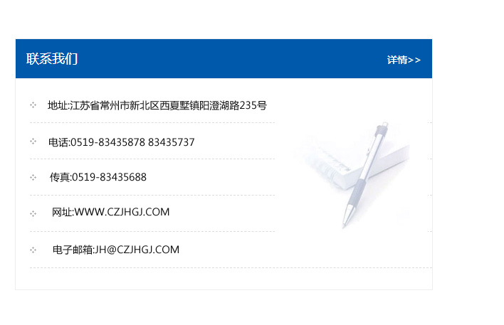 傳真:0519-83435688    郵編:213135    網址:WWW.czjhgj_com.szonlyonetech.com    電子郵箱:JH@czjhgj_com.szonlyonetech.com